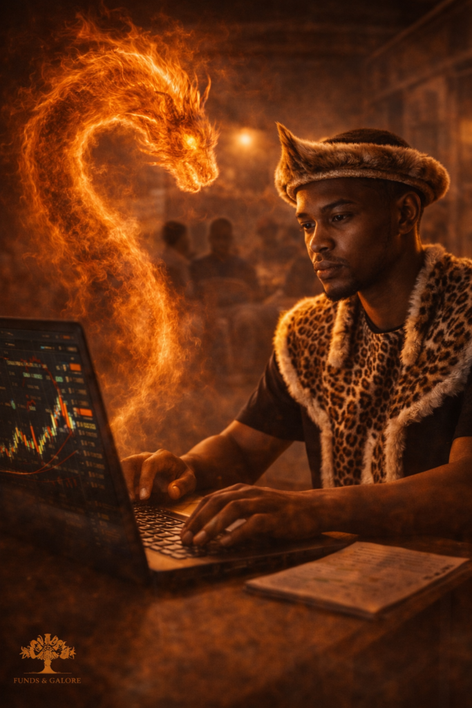 South African township trader journey showing a trader visualising wealth, freedom, and success while analysing market charts